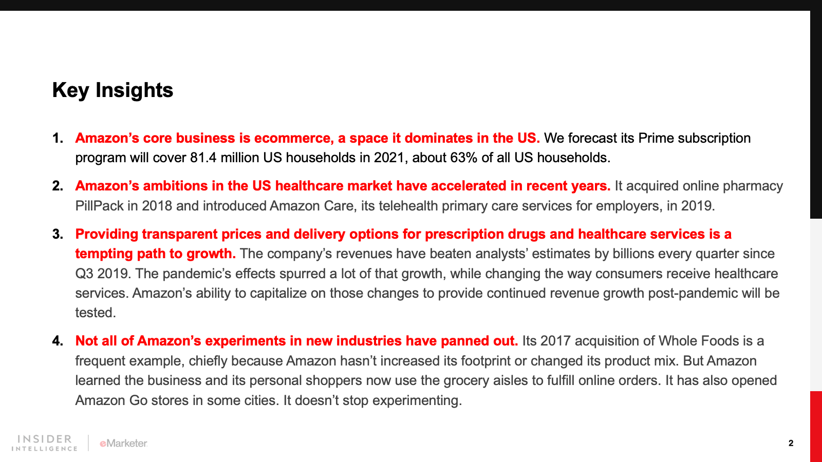 KEY STAT: Amazon owns ecommerce in the US, with sales expected to hit $386.40 billion in 2021, according to our forecast. With a market capitalization of almost $1.9 trillion as of mid-July, the company must find new areas with huge growth potential that build on its core ecommerce capability. The $4.01 trillion US healthcare market is a likely target.